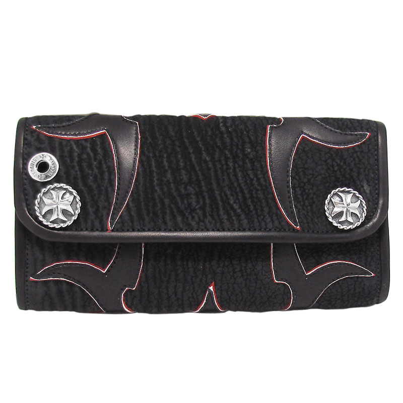 EXTRA LARGE 3-FOLD WALLET - SHARK TRIBAL CROSS ART SILVER STINGRAY INLAY AND RED WHITE TRIM