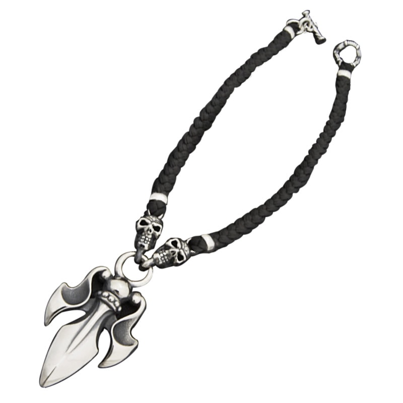 THE TRIDENT WITH 2 SKULLS WITH BRAIDED LEATHER NECKLACE WITH T-BAR CZ