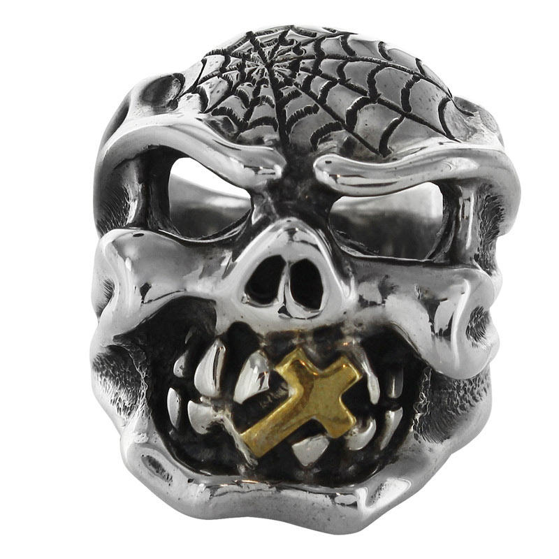 CHOMPS SKULL RING WITH BRASS CROSS TEETH AND SPIDER ENGRAVE