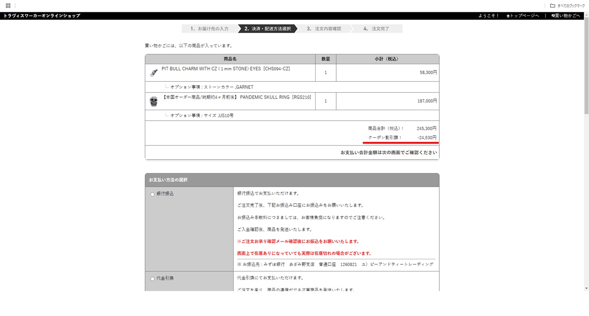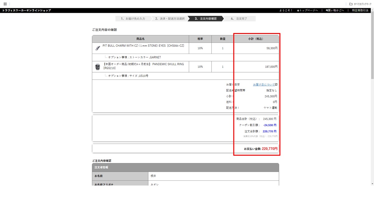 注文確認の明細欄に割引額が完了します。下記の画像のページ遷移をご確認ください。